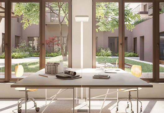 Kombination Wohnen + Arbeiten rund um einen begrünten Innenhof