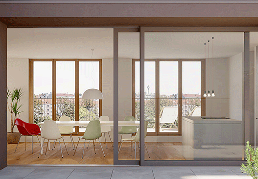 Großzügige Belichtung der Wohnungen durch Französische Fenster in Holz-Aluminium