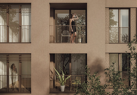Entlang des Straßenzuges entsteht ein mehrstöckiges Haupthaus. Großzügige Schaufenster öffnen sich im Erdgeschoß zur Stadt hin und werden zum offenen Vernetzungsort. Hinaus zur Puchsbaumgasse präsentiert sich Karl ganz städtisch mit seiner Ziegelfassade und hinein in einen ruhigen, begrünten Innenhof. Dabei wird im Parterre gearbeitet und in den Stockwerken darüber gewohnt. Mit hohen französischen Fenstern, privaten Loggien mit Ausblick und zwei Dachgeschossen mit urbanem Blick ins Grüne vereint er viel Spielraum für vielseitige Lebensentwürfe unter einem Dach.