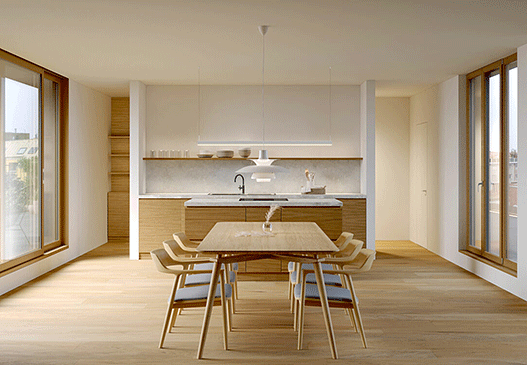 Großzügige Belichtung der Wohnungen durch Französische Fenster in Holz-Aluminium