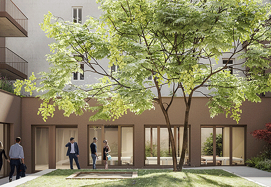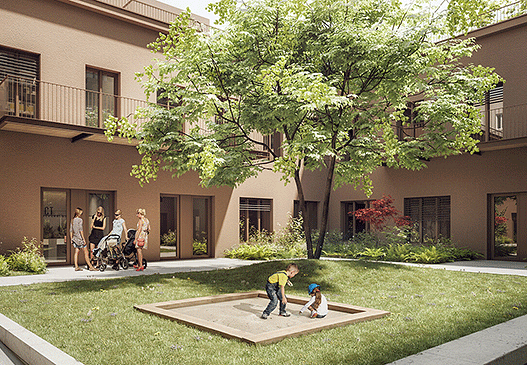 Kombination Wohnen + Arbeiten rund um einen begrünten Innenhof